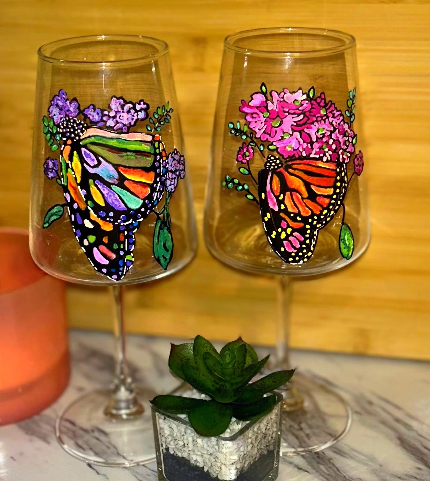 One day, I painted a set of wine glasses for a relative. They were a hit and so I decided to focus on designing and painting special glasses for others. Each glass goes through a process that preserves the artwork so that you can enjoy the glasses for many many many years.